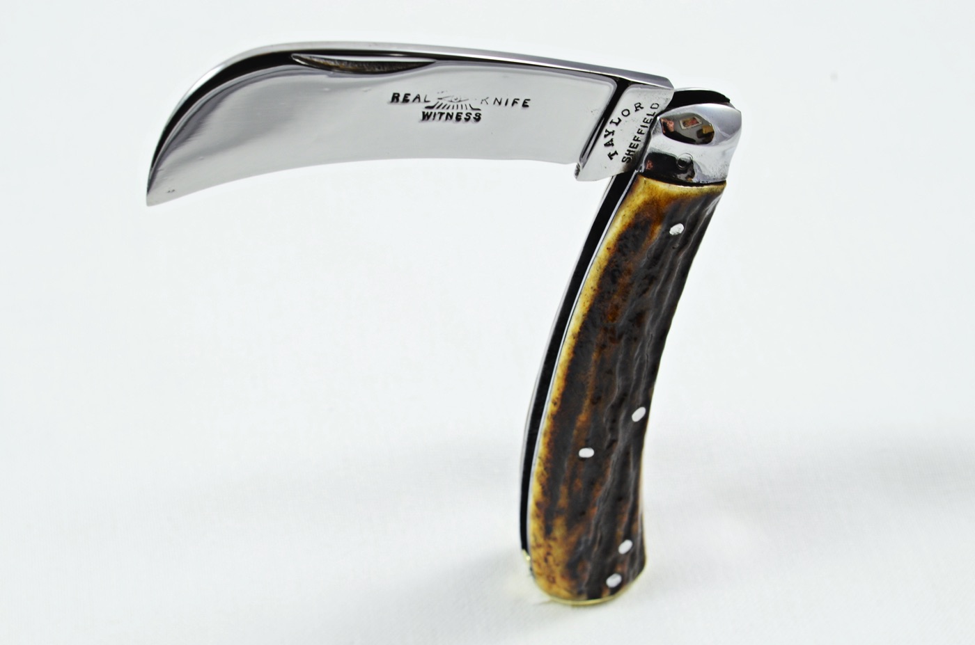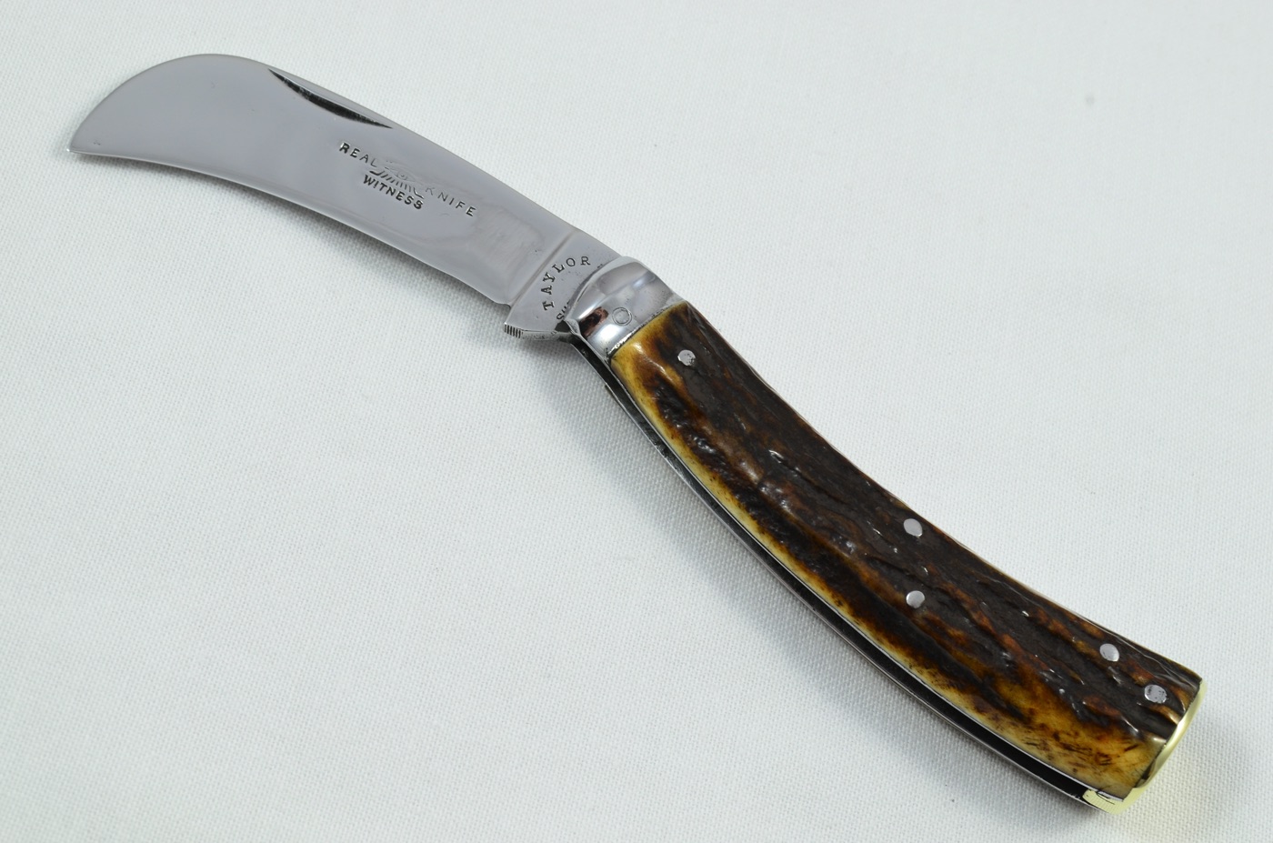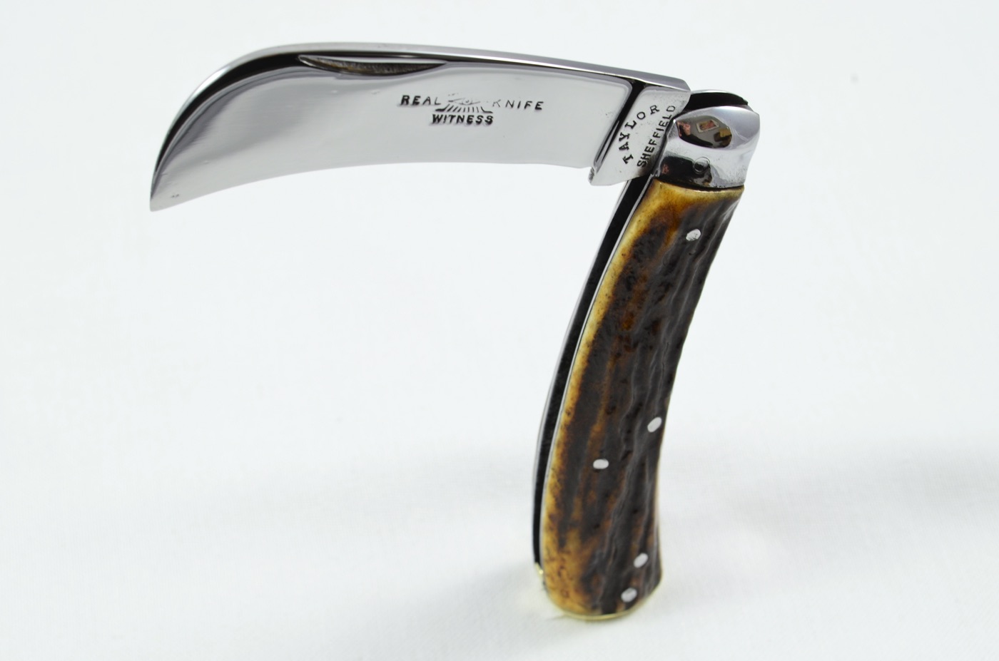We have an absolutely outstanding example of a Flat Bottomed Nickel Capped Pruning Knife manufactured by one of the finest – Taylors Eye Witness. TEW is one of the most respected and enduring names in Sheffield Cutlery, with a history that stretches back to 1820. Founded by John Taylor, the firm quickly established itself as a premier manufacturer of knives and edge tools, earning a reputation for reliability, cutting performance, and honest workmanship. The now-iconic Eye Witness mark became synonymous with trust and quality; a guarantee that a blade had been properly forged, heat treated, and finished to Sheffield’s exacting standards.