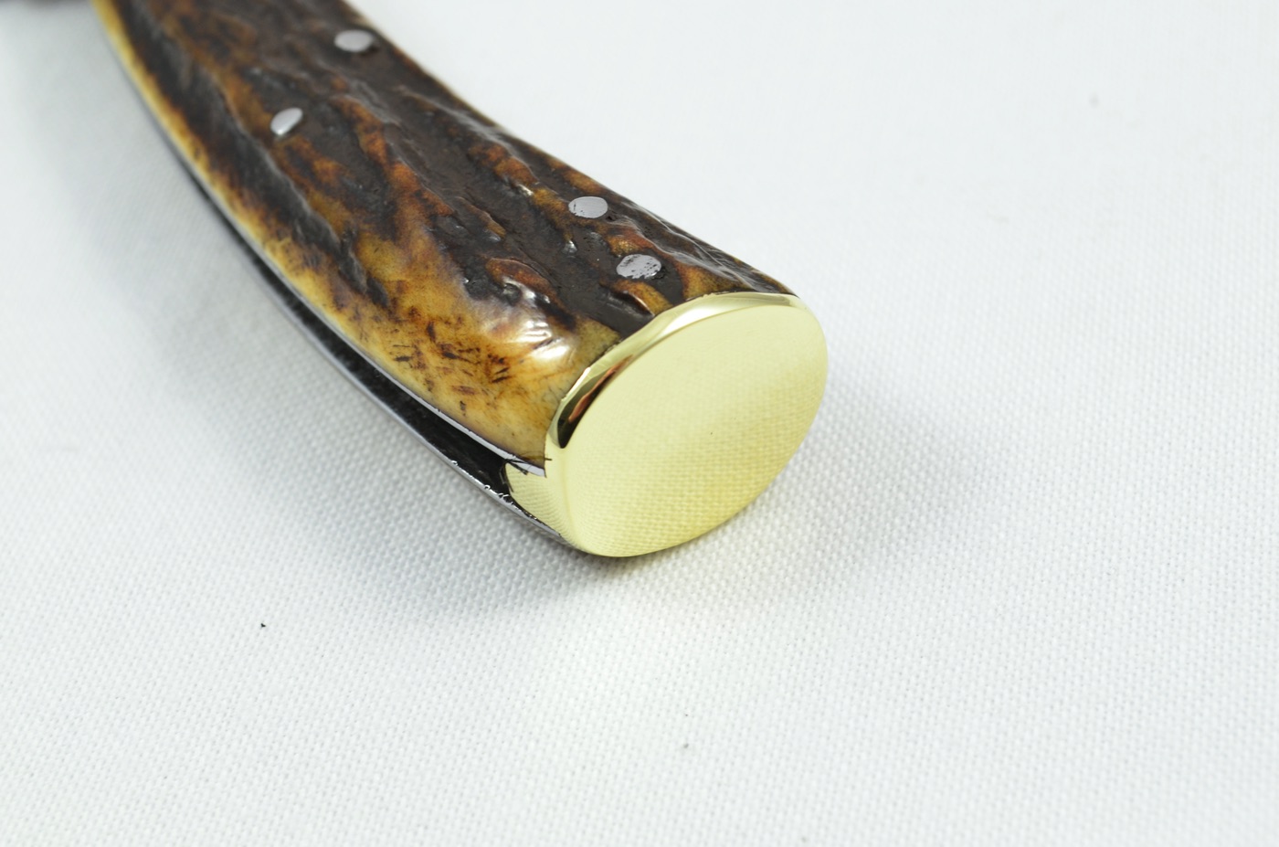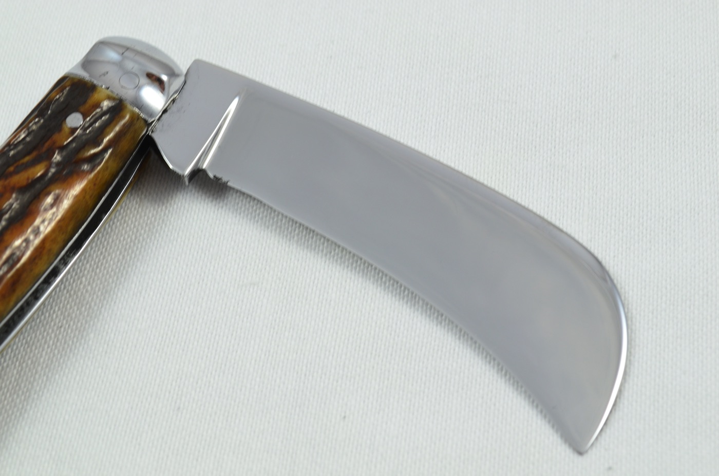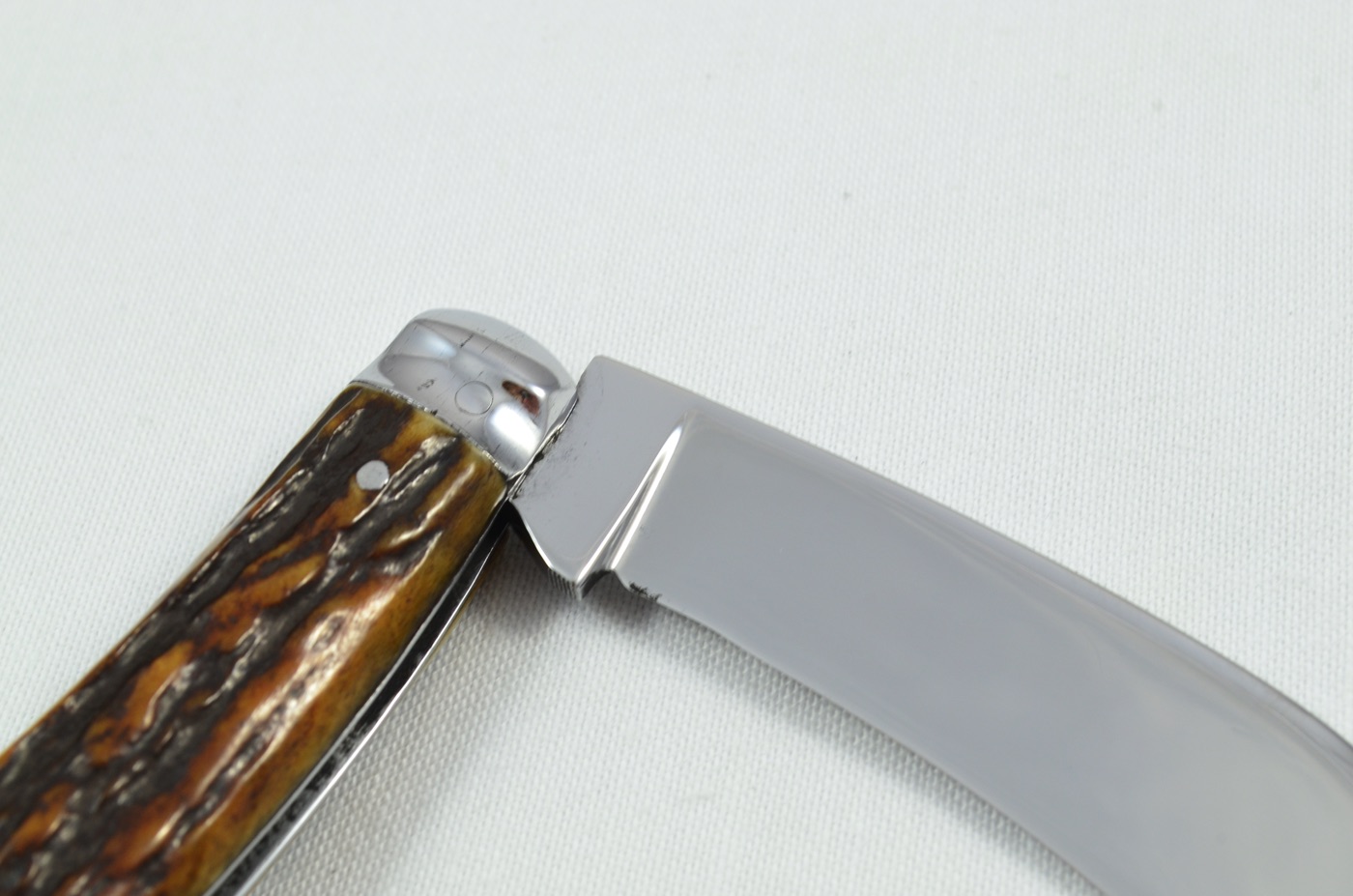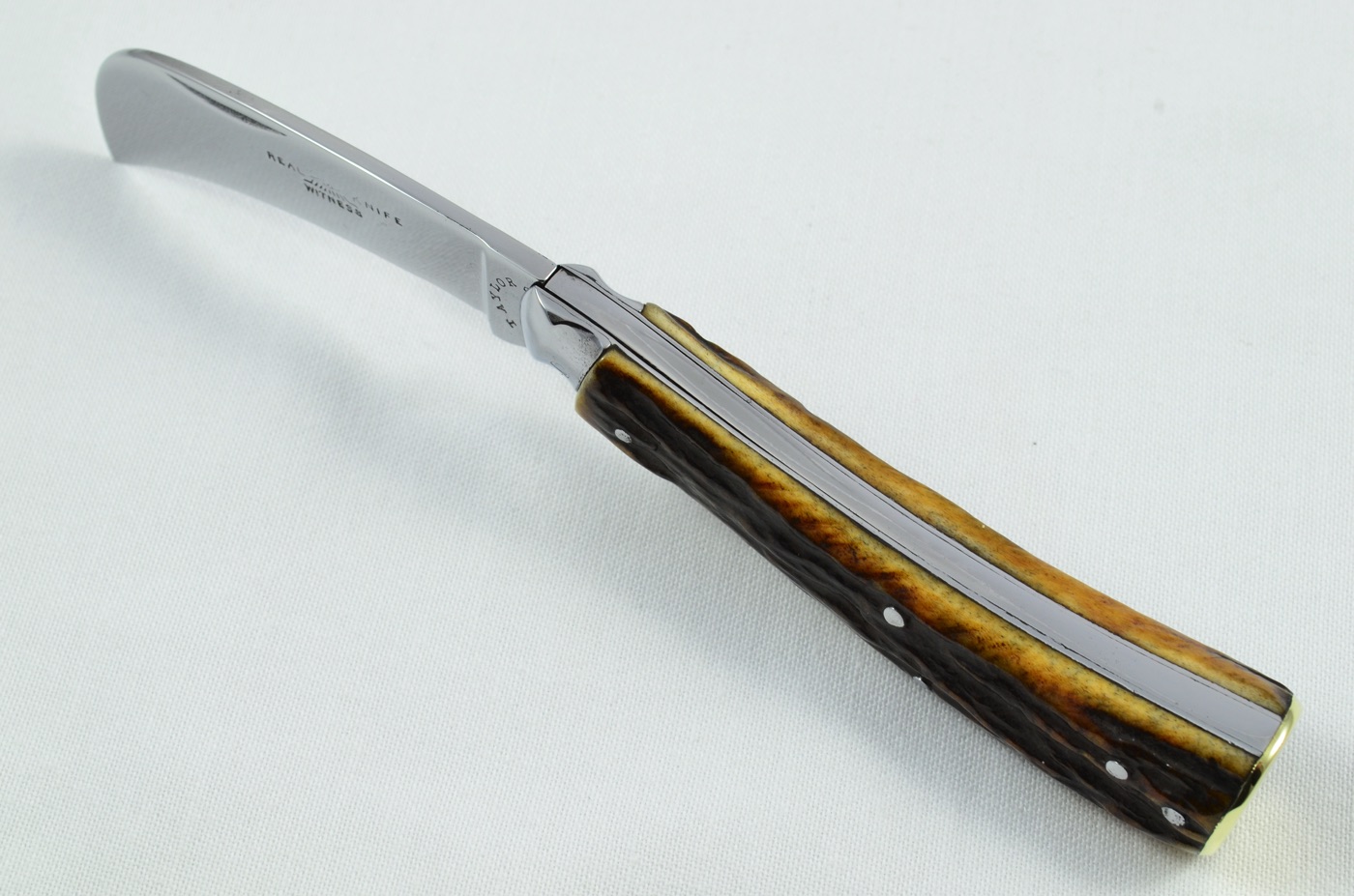 The scales are crafted from genuine sambar stag antler, beautifully figured and naturally contoured, giving the knife both visual character and a secure, comfortable grip in the hand. Nickel silver fittings complement the natural material, creating a balanced and traditional appearance that feels entirely appropriate for this historic pattern.