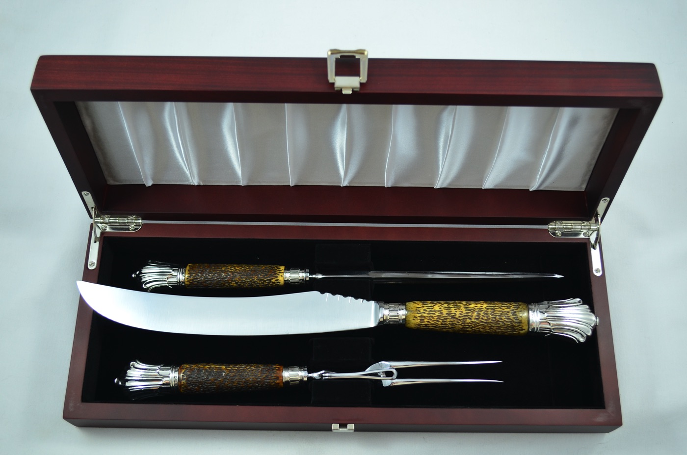 A Genuine Sheffield Carbon Steel and Silver Capped & Ferruled set, presented in its our Bespoke Wooden Cases (that are made to fit each individual Carving Set).