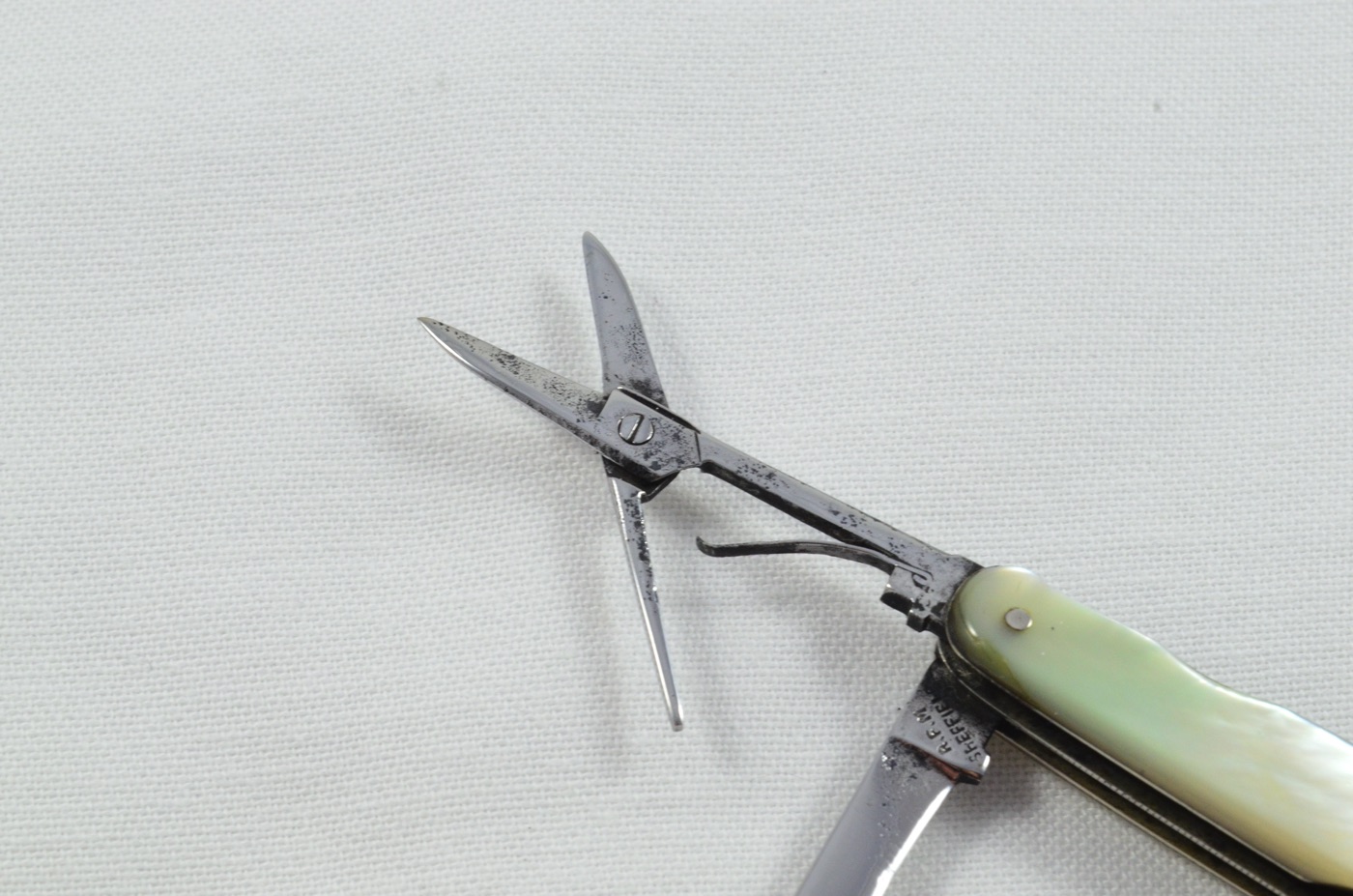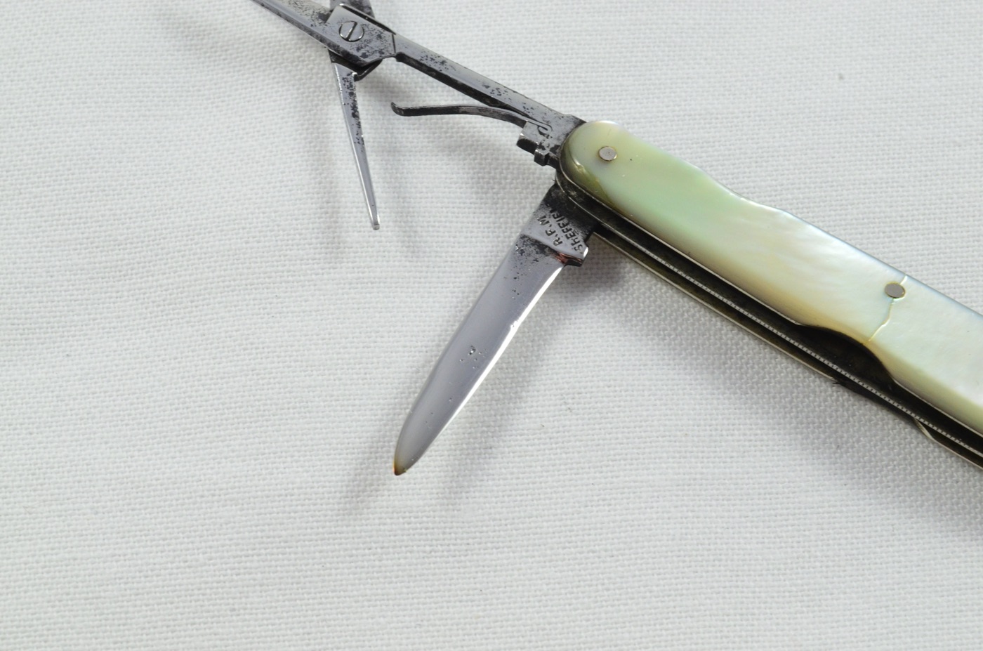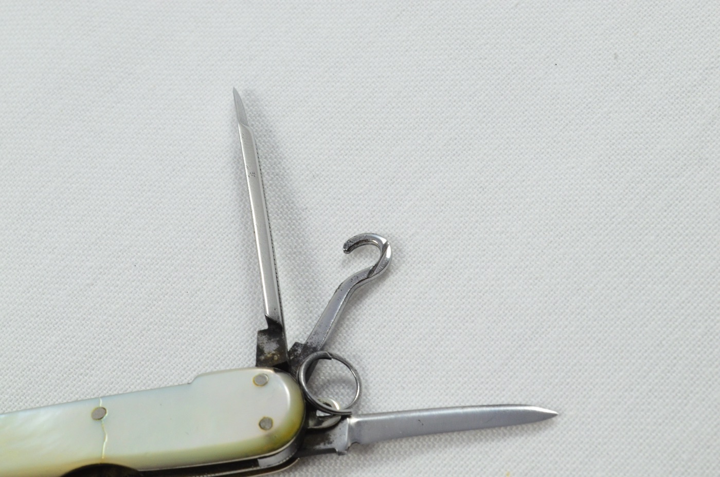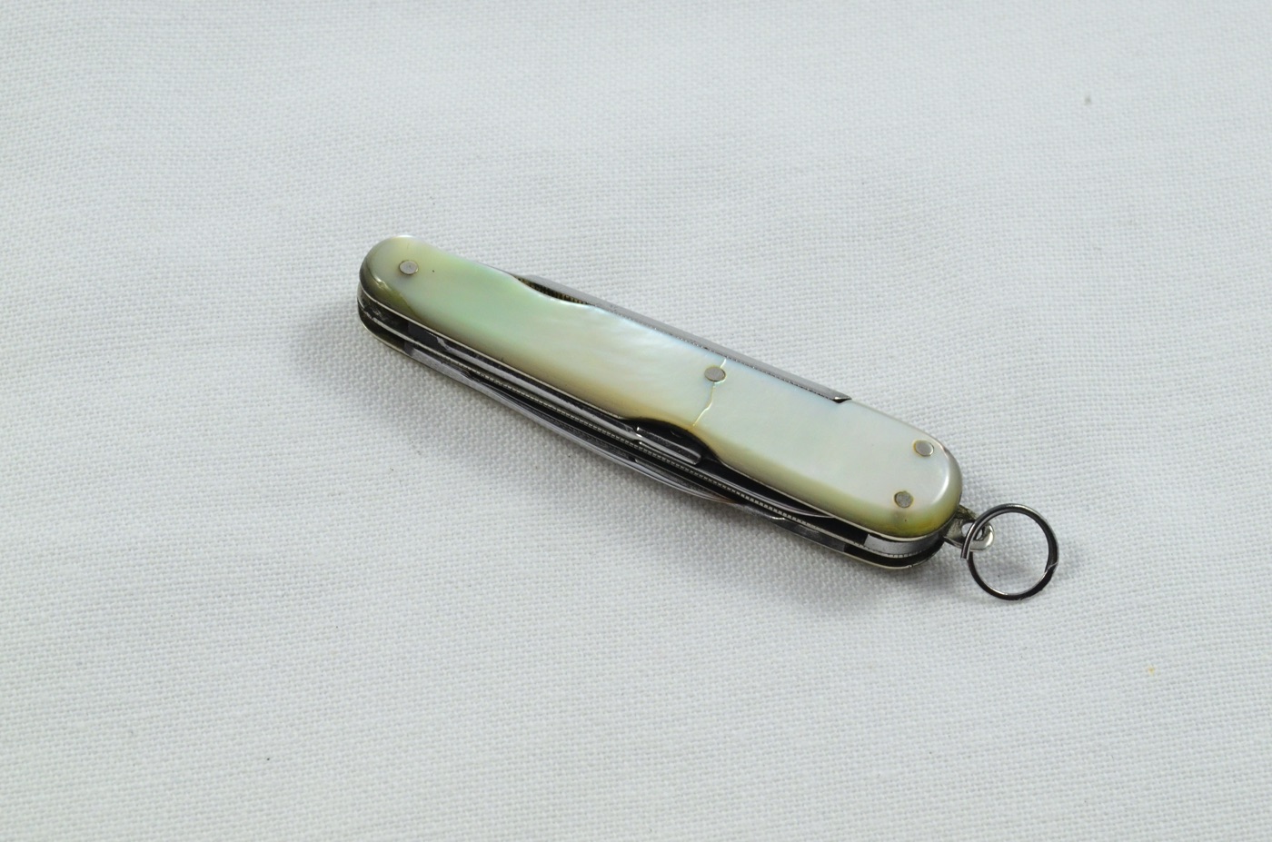 Full brass linings. The Mother of Pearl is tremendous, rich in colour and deep in pattern (one scale cracked). Blade 1 measures 3.5cm. Blade 2 measures 3cm. Scissors measures 4cm. Button Hook 2cm. File 4.5cm Closed length measures 5.5cm. Open length measures 14cm. The piece weighs 25 grammes, feel great in the hand and would be an excellent addition to any collection.
