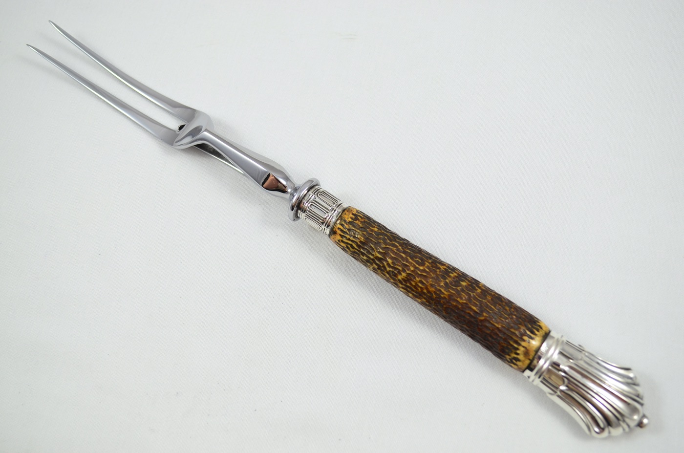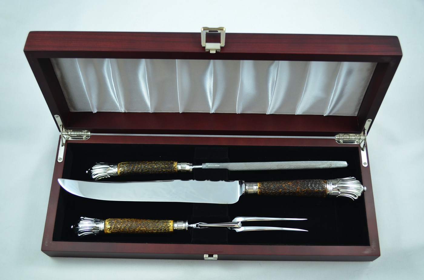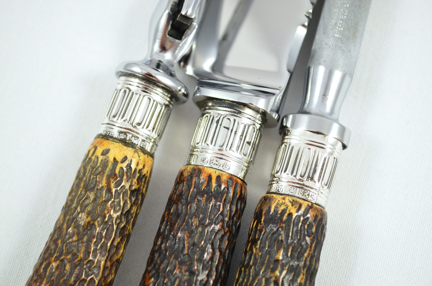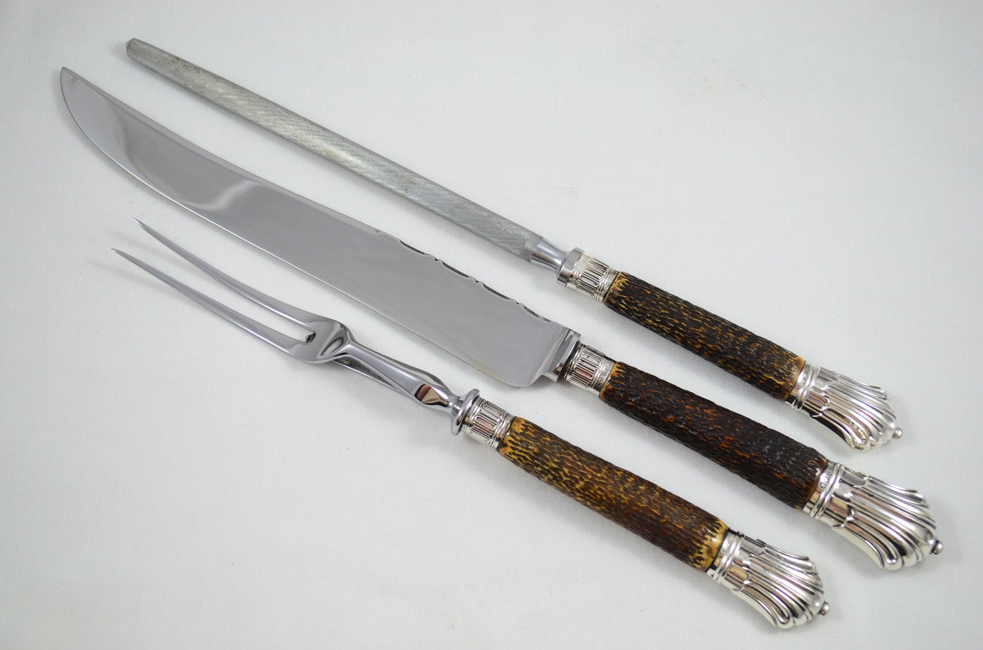 On offer today is a superb 3 Piece Carving Set featuring Solid Silver ‘Albany’ Pattern/Style Caps and Ferrules along with Sambar Stag Handles. Each piece has been beautifully restored by our Master Craftsmen here at The Sheffield Cutlery Shop.