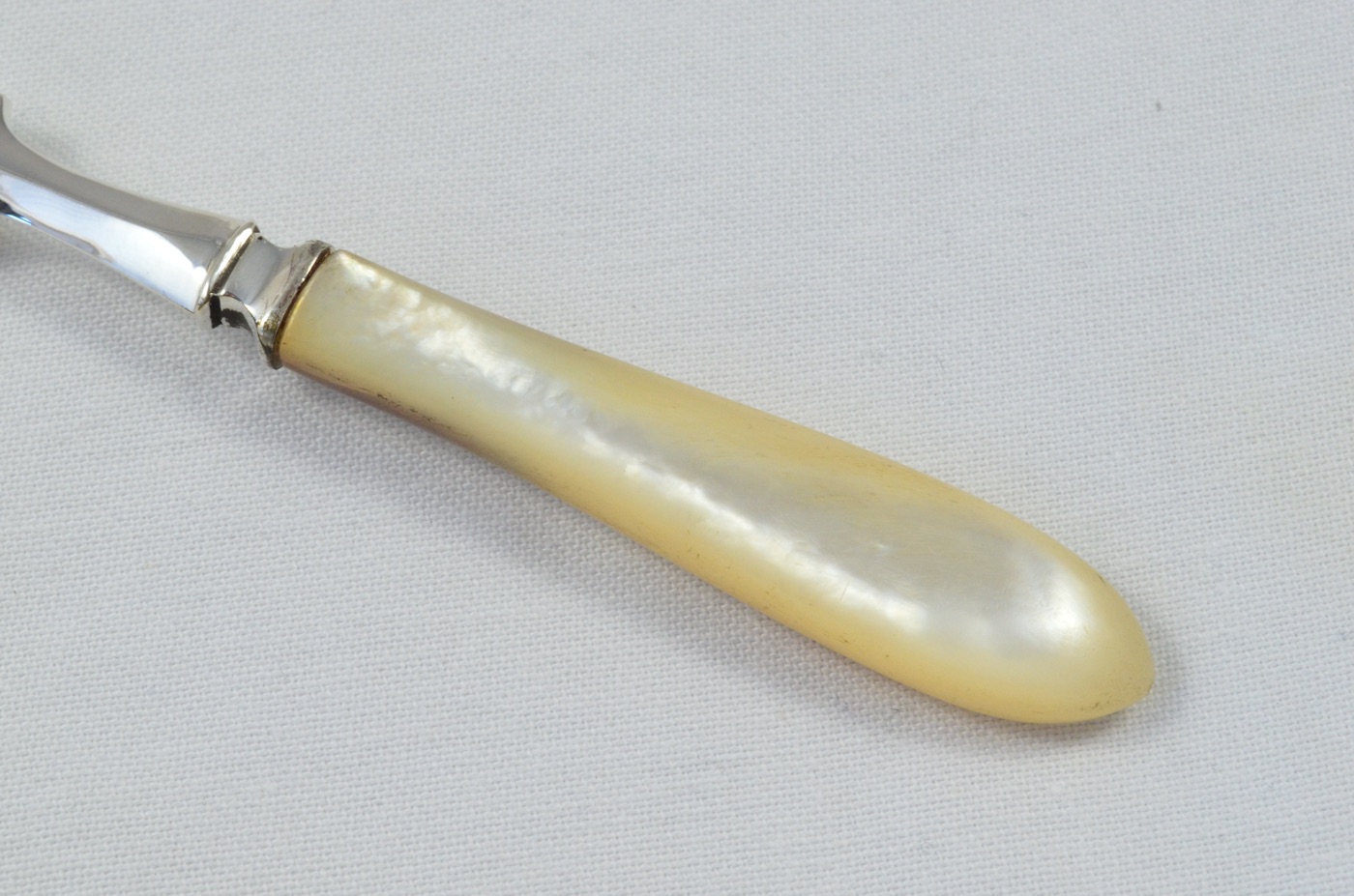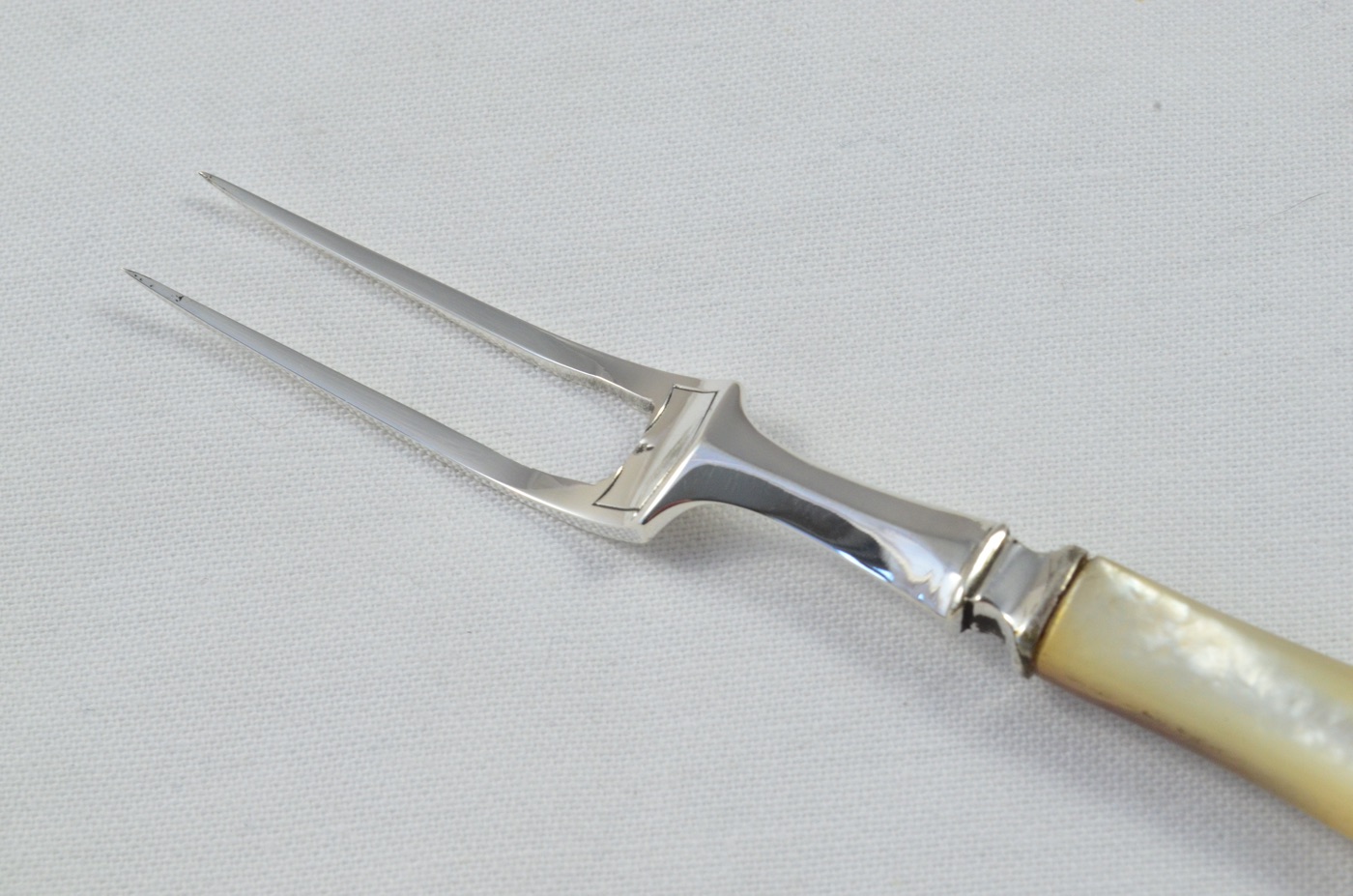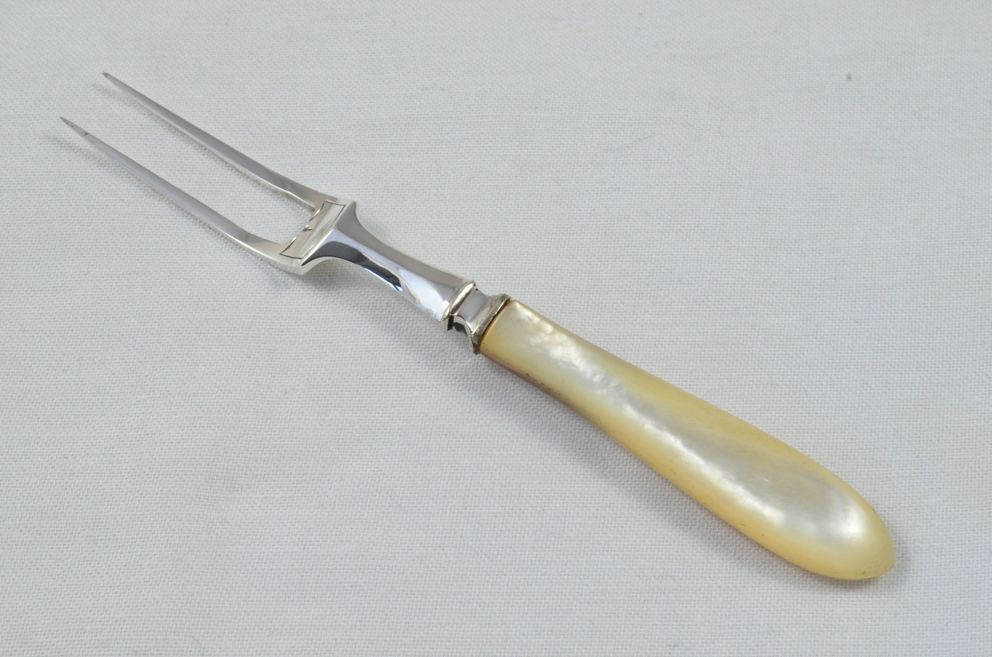 Made in Sheffield by Mappin & Webb (M&W), this stunning Olive Fork is bares a solid silver head, and has a beautiful mother of pearl handle. This item is mirror polished to perfection and the luminous pearl handle is in pristine condition.