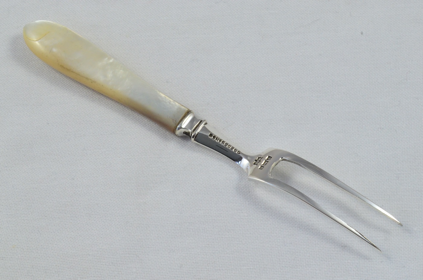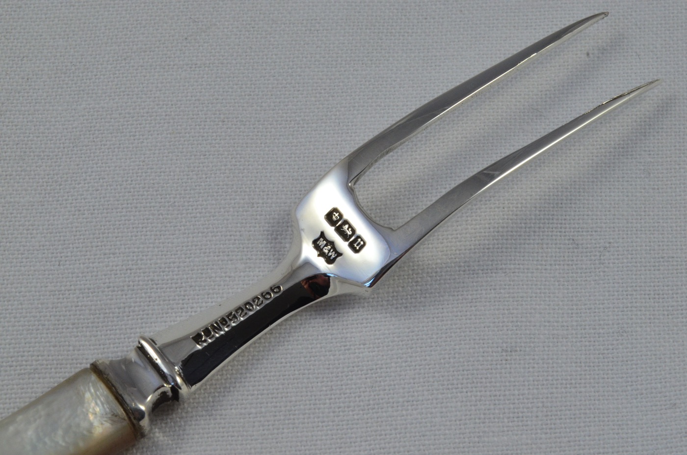 The Fork is hallmarked with the crown, lion passant and date letter u for 1912. It measures 14cm in length and weighs 24 grammes.
